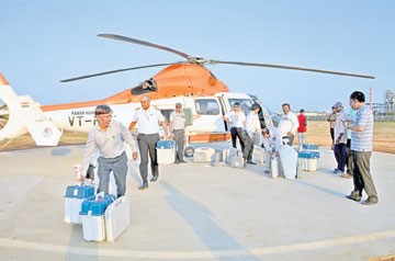 నక్సల్స్ ప్రభావిత ప్రాంతమైన తూర్పు గోదావరి జిల్లా ఏజెన్సీ లోతట్టు ప్రాంతంలో పోలింగ్ సామగ్రి తరలింపు కోసం రెండు హెలికాప్టర్లను వినియోగించారు. సాధారణ ప్రాంతాల్లో ఈవీఎంల తరలింపు కోసం ఆర్టీసీ బస్సులు సహా పోలీసు వాహనాలు వినియోగిస్తుండగా నక్సల్ ప్రభావిత ప్రాంతాల్లో తొలిసారి హెలికాప్టర్లను వినియోగించారు. వై.రామవరం మండలం గుర్తేడు, దారగడ్డ, పాతకోట, బొడ్డగండిల్లో ఏడు పోలింగ్ కేంద్రాలకు ప్రిసైడింగ్, సెక్టోరల్ అధికారులతో పాటు ఈవీఎంలను కాకినాడకు తరలించడానికి ఓఎన్జీసీకి చెందిన రెండు హెలికాప్టర్లను వినియోగించారు. సాయంత్రం 4 గంటలకే ఏజెన్సీలో పోలింగ్ ముగించి.. 5.30 గంటలకు ఈవీఎంలను, సిబ్బందిని సురక్షితంగా కాకినాడ తీసుకొచ్చినట్టు కలెక్టర్ కార్తికేయ మిశ్రా తెలిపారు.