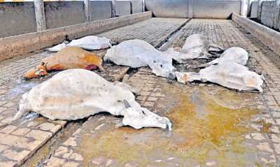 విజయవాడ ఇంద్రకీలాద్రిసమీపంలో కొందరు మార్వాడీలు గోసంరక్షణ సంఘాన్ని ఏర్పాటు చేసి ఆవులను సంరక్షిస్తున్నారు. ఈ ఆవరణ సరిపోకపోవడంతో కొత్తూరు తాడేపల్లిలో ఏడు ఎకరాల స్థలంలో మరో గోశాల ఏర్పాటు చేశారు. ఇక్కడ పది షెడ్లు, మూడు బ్యారక్ల్లో సుమారు 1500 ఆవులు ఉన్నాయి. కమిటీ సభ్యులు కొన్నాళ్ల కిందటిదాకా విజయవాడలో దాణాను కొనుగోలు చేసేవారు. ఇప్పుడు ప్రకాశం జిల్లా అద్దంకి నుంచి దాణా (ముక్కలుగా నరికిన పచ్చిగడ్డి) తెప్పించుకుంటున్నారు. శుక్రవారం అద్దంకి నుంచి 7,425 కిలోలు... విజయవాడ చుట్టుపక్కల నుంచి నాలుగు విడతలుగా 5,610 కిలోల పచ్చిమేత వచ్చింది. కార్మికులు శుక్రవారం రాత్రి దీనిని గోవులకు ఆహారంగా వేశారు. రాత్రి 9.30 గంటల నుంచి ఆవులు నిలబడిన చోటే పడిపోసాగాయి. నోరు, ముక్కు నుంచి నురగలు వచ్చాయి. రాత్రి 10 గంటల సమయానికి ఒక ఆవు చనిపోయింది. అప్పటి నుంచి ఒక్కో గంట గడిచేకొద్దీ మృత్యుఘోష మరింత పెరిగింది. కమిటీ సభ్యులు అప్పటికప్పుడు పశు సంవర్ధక శాఖ వైద్యులకు సమాచారం ఇచ్చారు. గోశాలలో సుమారు 1500 ఆవులు ఉండగా... 128 ఆవులు మాత్రం అస్వస్థతకు గురయ్యాయి.