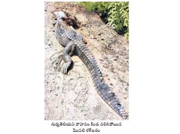 జుపాలెం(గుంటూరు జిల్లా): జిల్లాలో రోడ్డు ప్రమాదాలు అధికం. ఏటా వందల ప్రాణాలు గాల్లో కలుస్తూ ఉంటాయి. పాపం, ఈ విషయాలు తెలియని మొసలి రోడ్డుపైకి వచ్చింది. గుర్తు తెలియని వాహనం కిందపడి నలిగి చనిపోయింది. మండలంలోని అనుపాలెం గ్రామ సమీపంలో వాగు ఉంది. అందులో ఉండే మొసలి ఉందనీ, సమీప మాగాణి పొలాల్లో సంచరిస్తుంటుందనీ స్థానికులు అనుకునే వారు. అయితే వారెవరూ దాన్ని ఇప్పటివరకు చూడలేదు. శనివారం రాత్రి కూడా బయటకు వచ్చిన మొసలి గుర్తుతెలియని వాహనం కిందపడి మృతి చెందింది. సమాచారం అందుకున్న కోనంకి బీట్ ఆధికారి అమీర్ జానీ బాషా సంఘటన స్థలానికి వచ్చి మొసలి కళేబరాన్ని పరిశీలించారు. బ్రాహ్మణపల్లి పశు వైద్యాధికారి వంశీని పిలిపించి పోస్టుమార్టమ్ అనంతరం దహనం చేశారు. ఏడెనిమిది అడుగుల పొడవున్న ఆ మొసలి వయసు సుమారు మూడేళ్లు ఉండవచ్చని జానీ బాషా చెప్పారు. సంఘటన స్థలం సమీపంలో రైల్వే అండర్ బ్రిడ్జి నిర్మిస్తుండడంతో నిత్యం లారీల రాకపోకలు జరుగుతున్నట్లు గ్రామస్థులు చెబుతున్నారు. ఈ క్రమంలోనే లారీ లేదా ట్రాక్టర్ కిందపడి మొసలి చనిపోయి ఉంటుందని వారు అంటున్నారు.