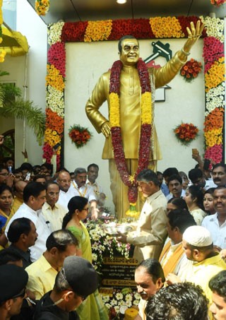 ఎన్టీఆర్ స్ఫూర్తితో ముందుకెళ్లి ప్రజల అభిమానం, సహకారం చూరగొందామని పిలుపిచ్చారు. నందమూరి తారకరామారావు 96వ జయంతి కార్యక్రమాన్ని గుంటూరులోని తెలుగుదేశం పార్టీ రాష్ట్ర కార్యాలయంలో మంగళవారం ఘనంగా నిర్వహించారు. ఎన్నికల్లో పరాజయం పాలైన తర్వాత ఏర్పాటు చేసిన తొలి కార్యక్రమం కావడంతో నేతలు, కార్యకర్తలు తీవ్ర భావోద్వేగానికి లోనయ్యారు. వారికి సీనియర్ నేతలు ధైర్యం చెప్పారు. చంద్రబాబు తన సతీమణి భువనేశ్వరితో కలిసి వచ్చారు. ఎన్టీఆర్ విగ్రహానికి పూలమాలలు వేసి ఘనంగా నివాళులర్పించారు. అనంతరం టీడీపీ జెండాను ఎగురవేశారు. అనంతరం.. నాకు ప్రాణ సమానమైన టీడీపీ కుటుంబ సభ్యులందరికి శుభాభినందనలంటూ ప్రసంగాన్ని ప్రారంభించారు.